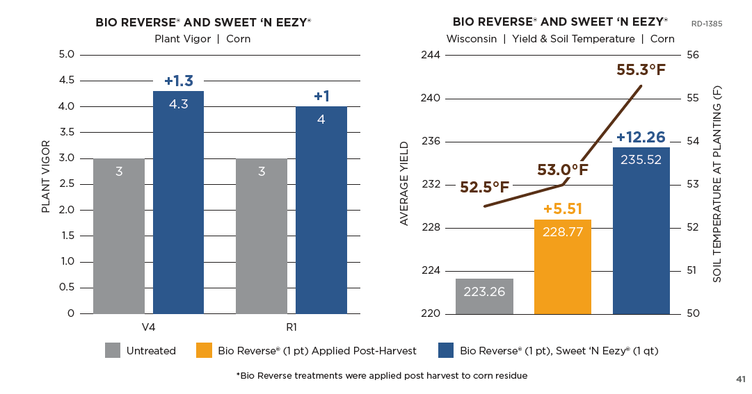 In field trials conducted in Wisconsin, residue treated with Bio Reverse and Sweet ‘n Eezy® warmed up faster in the spring, resulting in planting dates up to five days earlier than the untreated check.